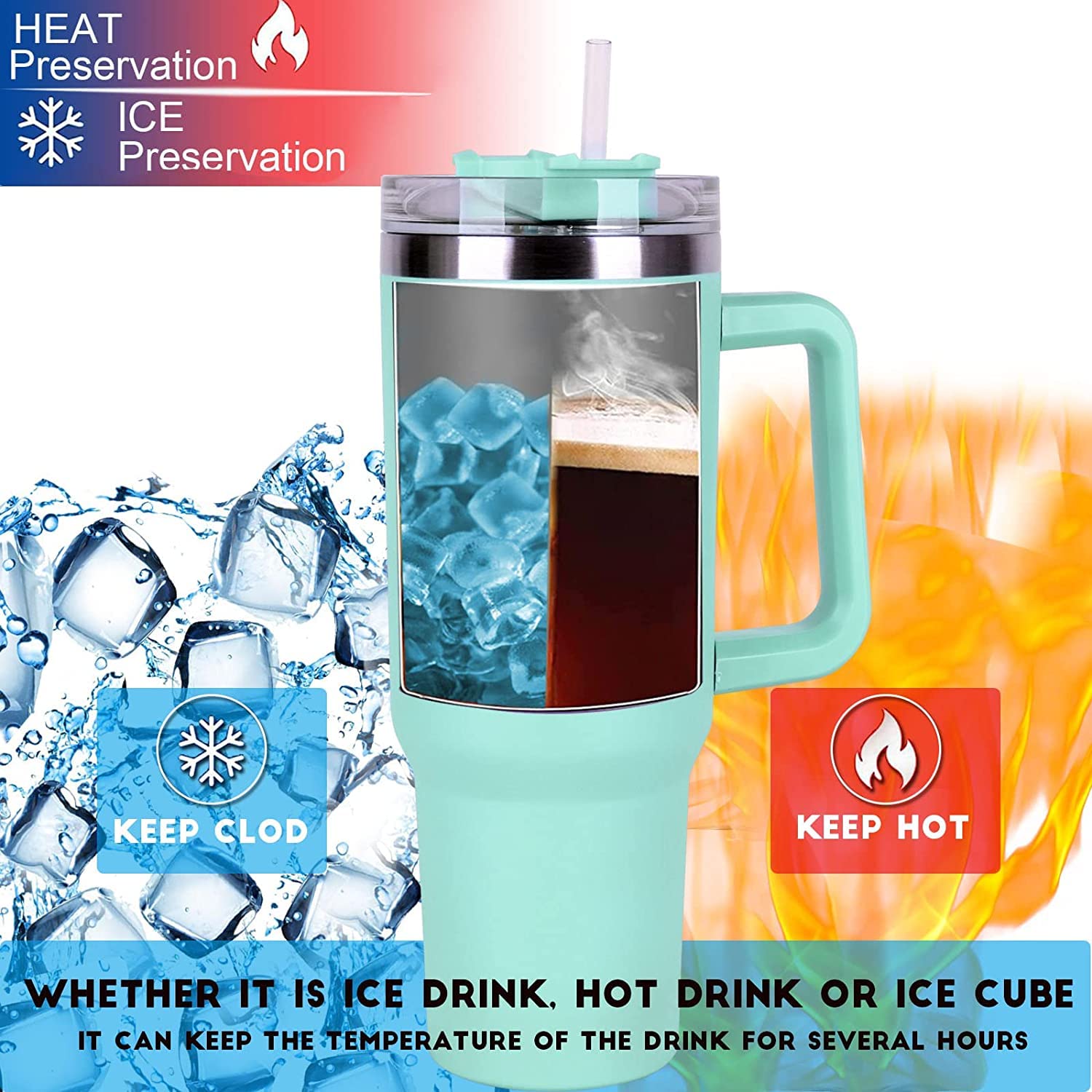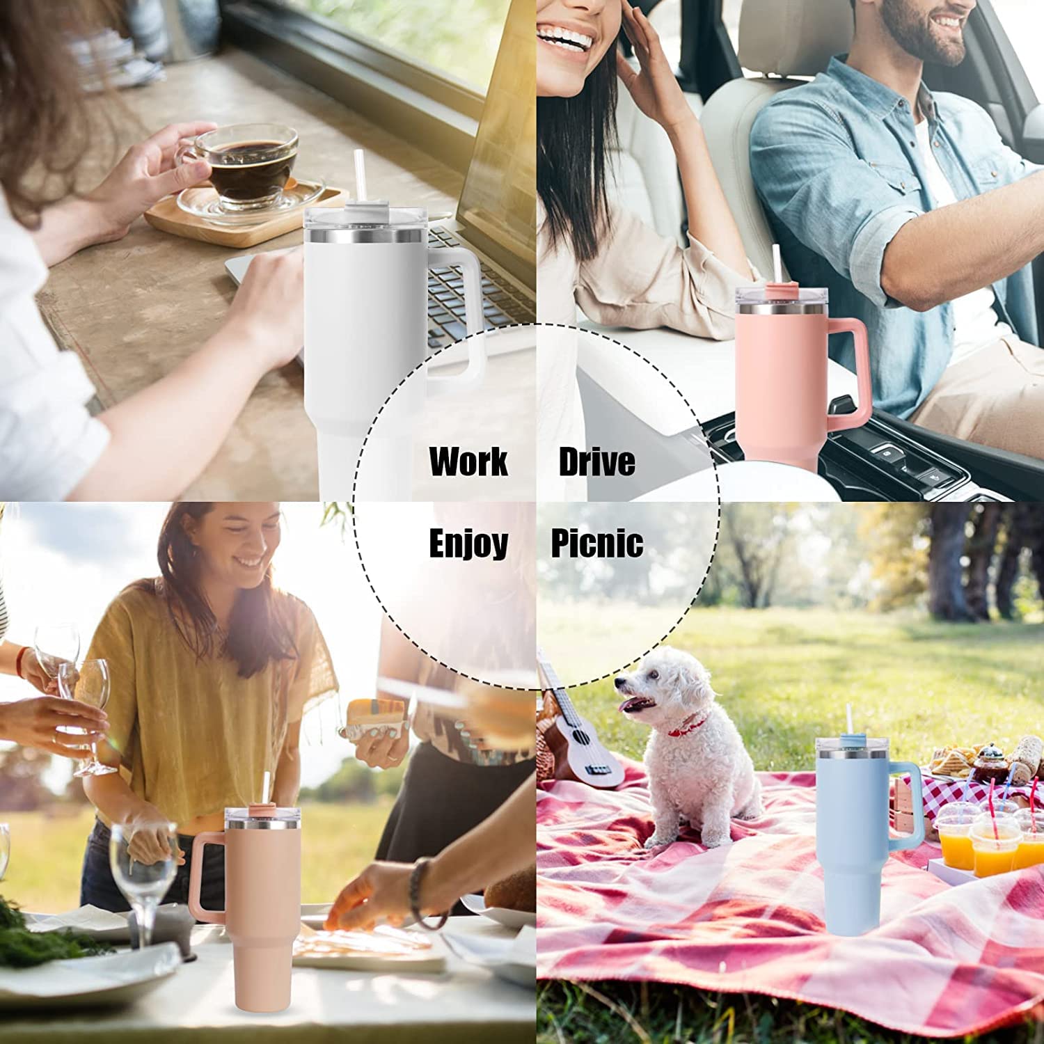 Large 40oz insulated tumbler with straw and handle—keeps drinks hot or cold for hours.