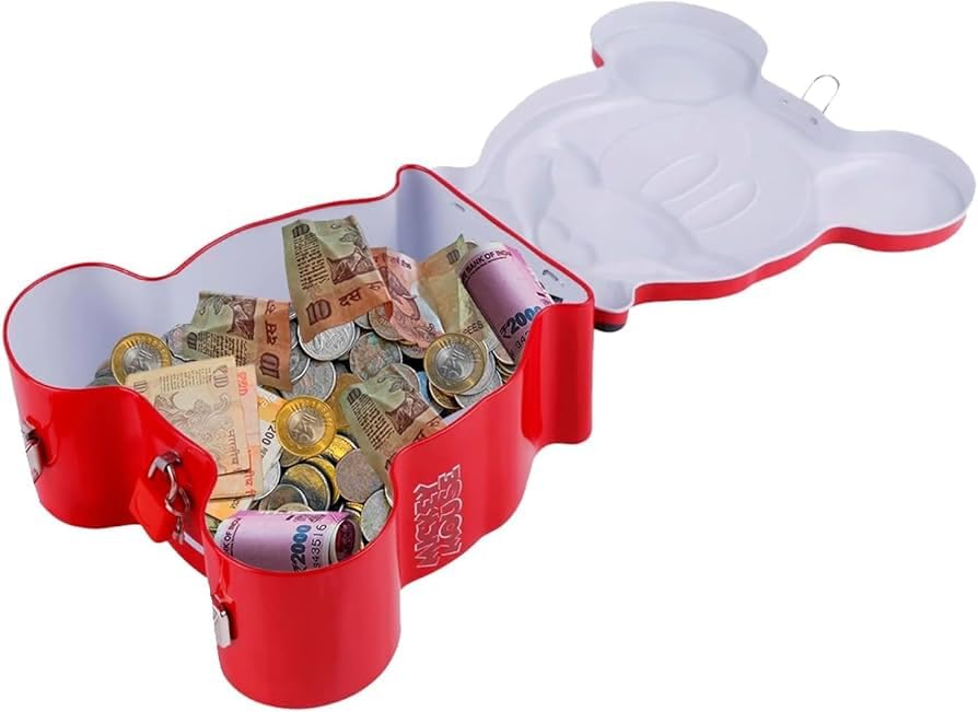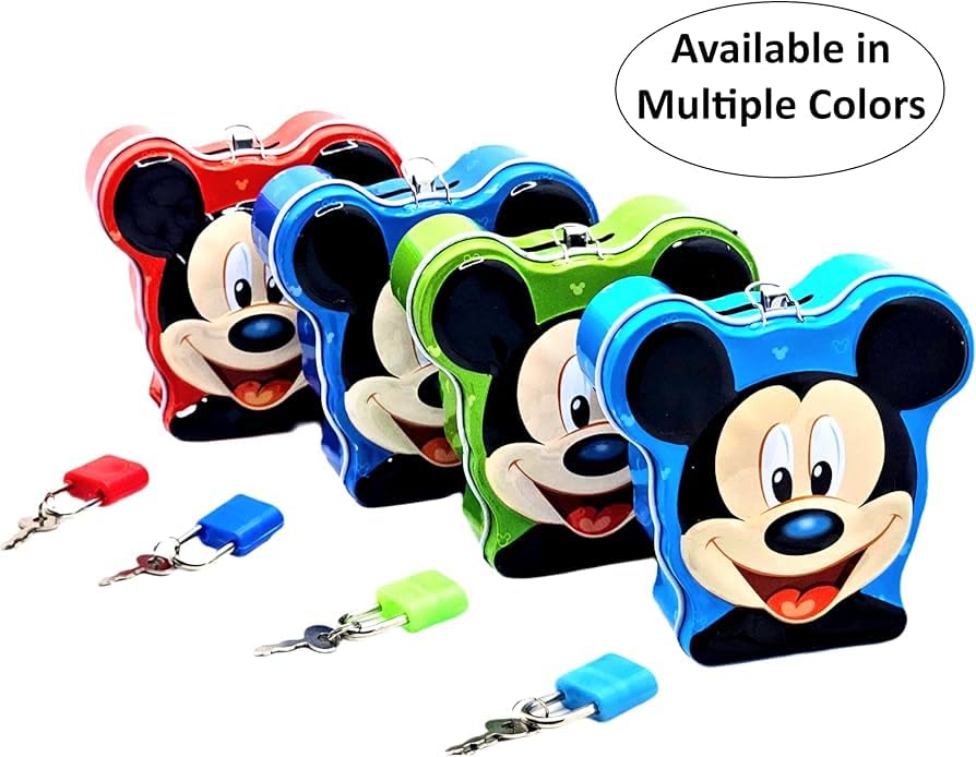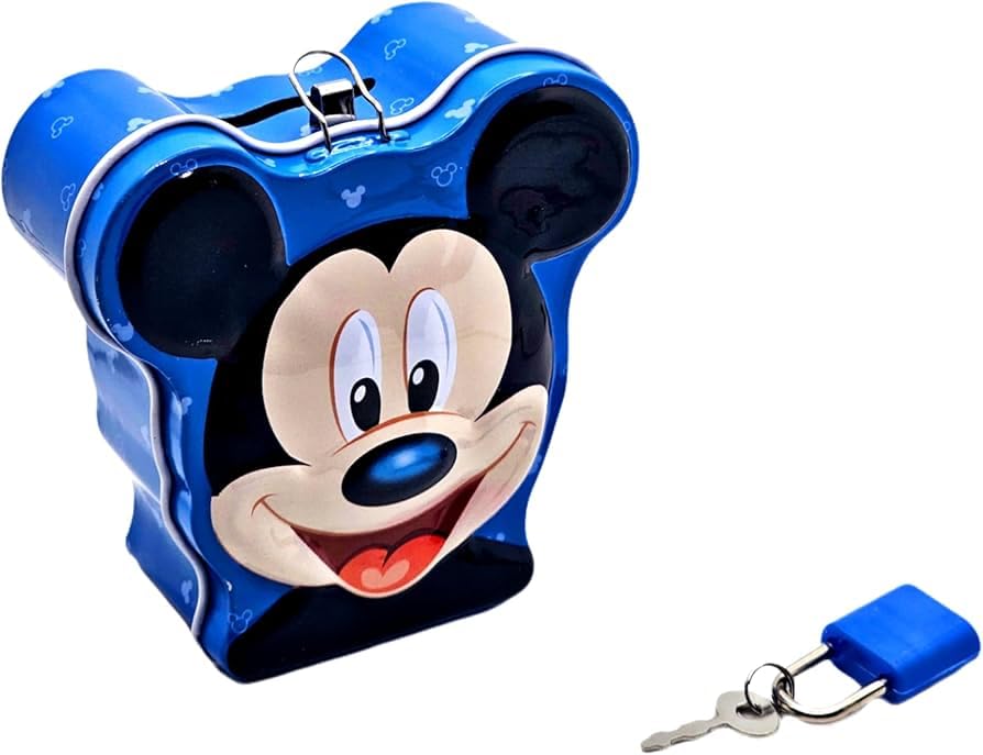 Cute Mickey Mouse piggy bank with lock—perfect for kids to save money in a fun way.